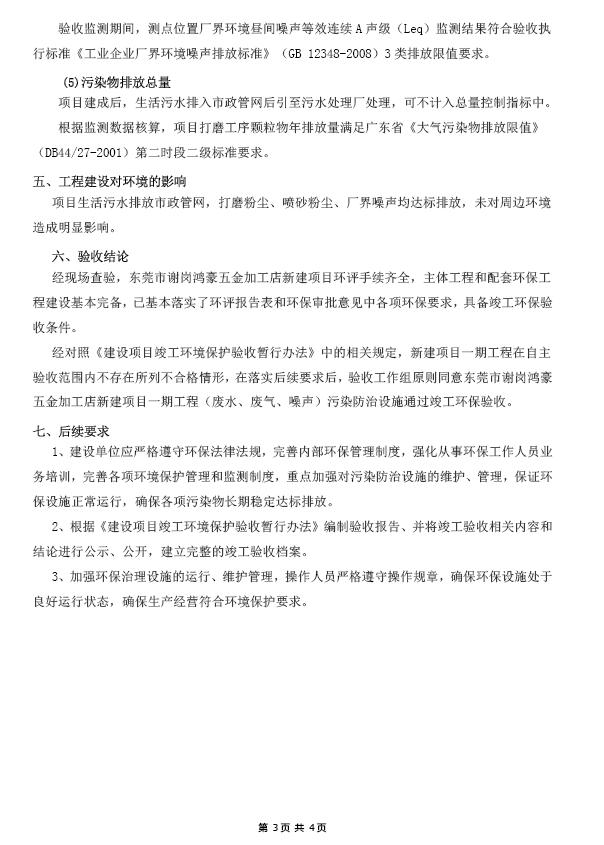 根据《国务院关于修改〈建设项目竣工环境保护管理条例〉的决定》(国务院令第682号),以及环保部《关于发布<建设项目竣工环境保护验收暂行办法>的公告》(国环规环评[2017]4号),现将东莞市谢岗鸿豪五金加工店(新建)(一期)项目竣工环境保护验收内容(包括验收监测报告、验收意见)公示如下: