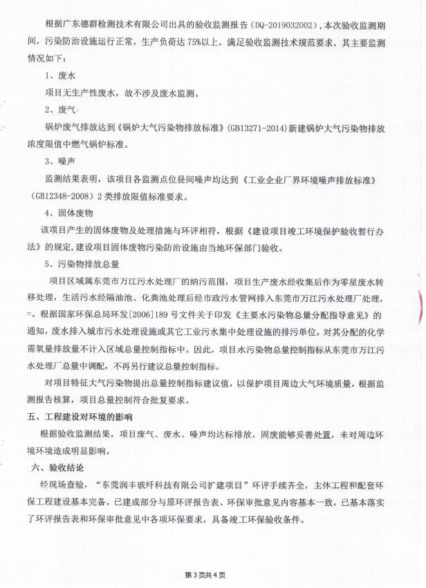 根据《国务院关于修改〈建设项目竣工环境保护管理条例〉的决定》(国务院令第682号),以及环保部《关于发布<建设项目竣工环境保护验收暂行办法>的公告》(国环规环评[2017]4号),现将东莞润丰玻纤科技有限公司(二期)项目竣工环境保护验收内容公示如下: