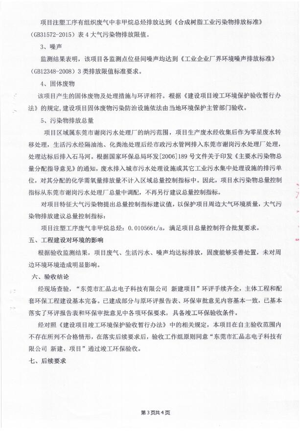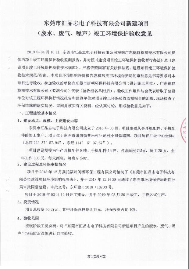 根据《国务院关于修改〈建设项目竣工环境保护管理条例〉的决定》(国务院令第682号),以及环保部《关于发布<建设项目竣工环境保护验收暂行办法>的公告》(国环规环评[2017]4号),现将东莞市汇品志电子科技有限公司(新建)项目竣工环境保护验收内容公示如下: