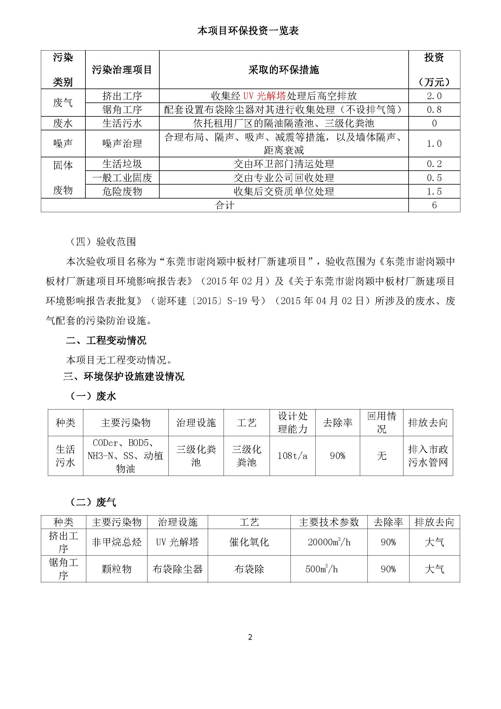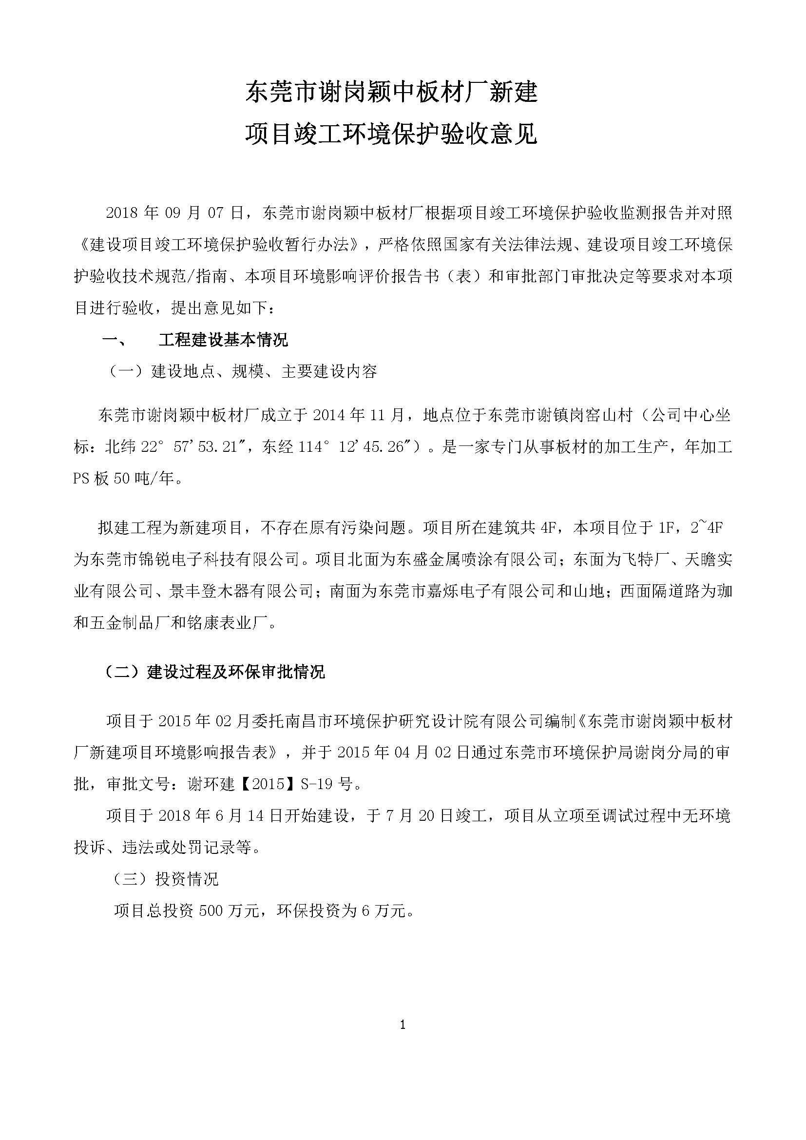 根据《国务院关于修改〈建设项目竣工环境保护管理条例〉的决定》(国务院令第682号),以及环保部《关于发布<建设项目竣工环境保护验收暂行办法>的公告》(国环规环评[2017]4号),现将东莞市谢岗颖中板材厂新建项目竣工环境保护验收内容(包括验收监测报告、验收意见)公示如下: