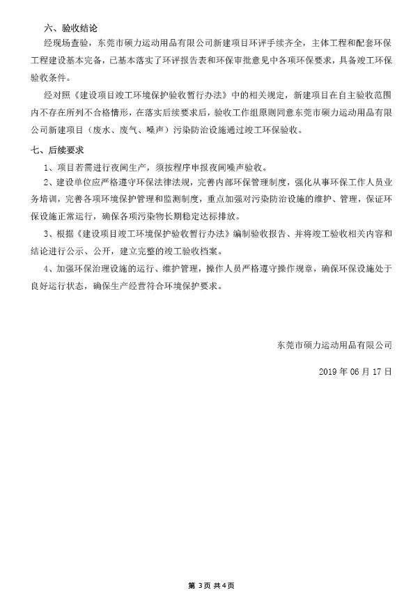 根据《国务院关于修改〈建设项目竣工环境保护管理条例〉的决定》(国务院令第682号),以及环保部《关于发布<建设项目竣工环境保护验收暂行办法>的公告》(国环规环评[2017]4号),现将东莞市硕力运动用品有限公司(新建)项目竣工环境保护验收内容(包括验收监测报告、验收意见)公示如下: