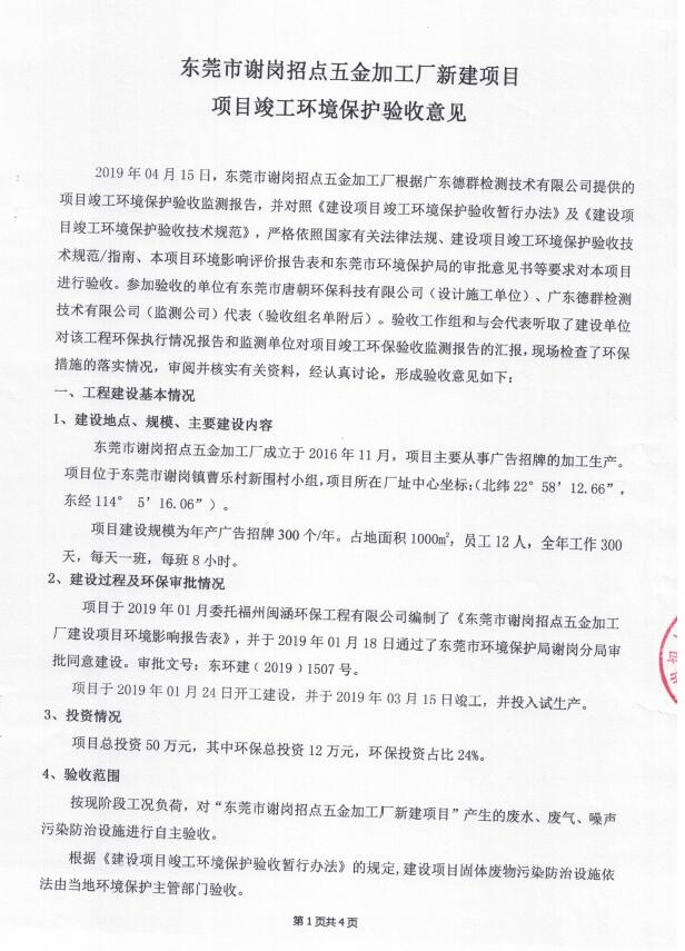 东莞市谢岗招点五金加工厂(新建)自主验收公示