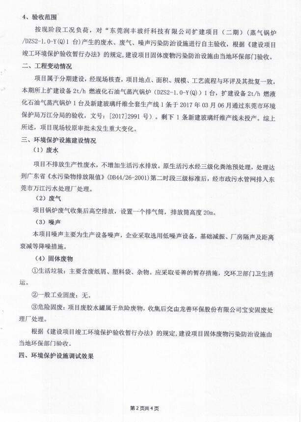 根据《国务院关于修改〈建设项目竣工环境保护管理条例〉的决定》(国务院令第682号),以及环保部《关于发布<建设项目竣工环境保护验收暂行办法>的公告》(国环规环评[2017]4号),现将东莞润丰玻纤科技有限公司(二期)项目竣工环境保护验收内容公示如下: